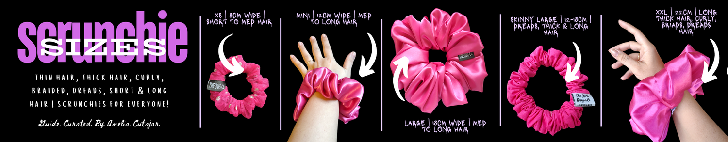2. We are the only small business that offer 6 different scrunchie sizes including SX (8cm), MINI (12cm), Large (18cm), Large Skinny (12-16cm), XXL (22cm), Dreads XXL (15cm).